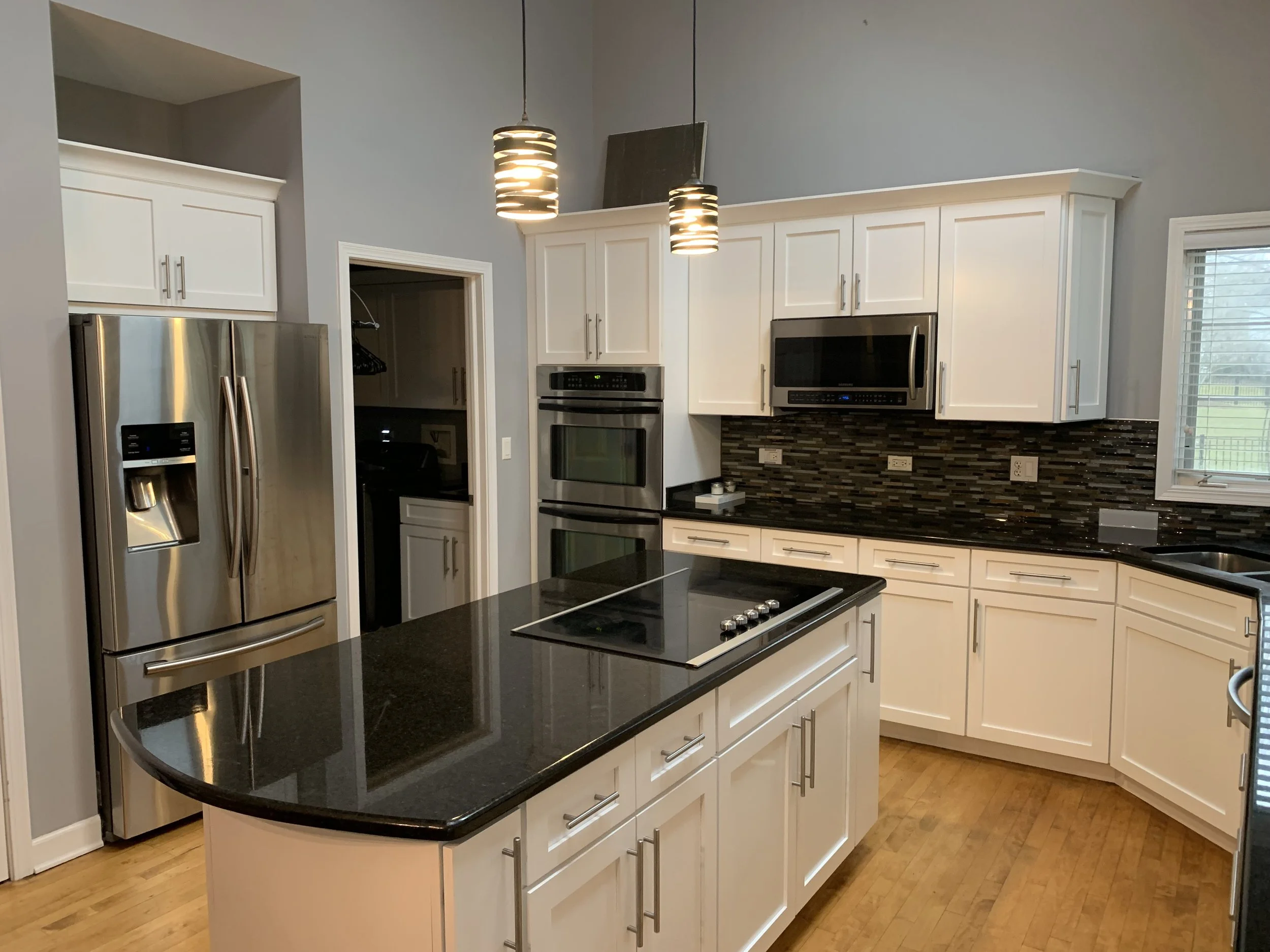 A cabinet refacing that included new doors and drawer faces, adding a new cabinet box to the island, new handles, new hinges, and crown.